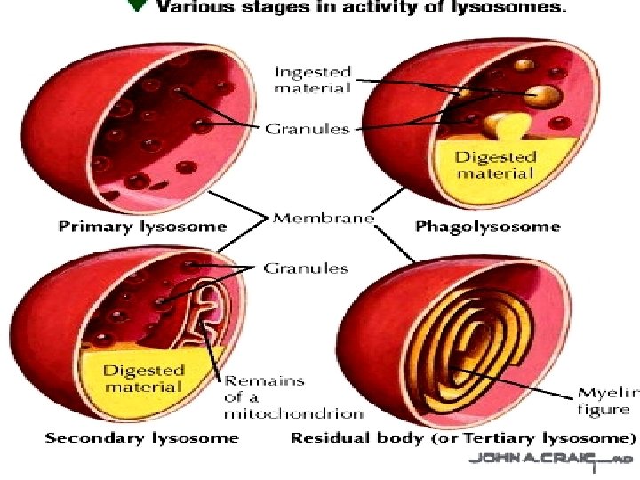 LISOSOM q Sebagai sistem pencerna intraseluler karena adanya enzim asam hidrolase → degradasi makromolekul dengan memelihara p. H lingkungan melalui pompa H+ q Ketiadaan enzim yang sangat spesifik ini → penumpukan substrat yang harus dicerna → penyakit penyimpanan lisosomal → tidak ada signal untuk enzim lisosom masuk jalur sekretori, seperti penyakit Tay-Sachs → akumulasi glikolipid pada neuron terurama CNS q Berperan pada jalur endositik → endositosis, autofagi & fagositosis dengan vesikel-vesikel : endosom, autosom & fagosom q Bentuk bermacam-macam dan terdapat pada semua sel kecuali eritrosit q Terbagi : lisosom primer & lisosom sekunder q Dapat dilepaskan dengan eksositosis, terdapat krinofagi & berperan pada mekanisme pertahanan diri