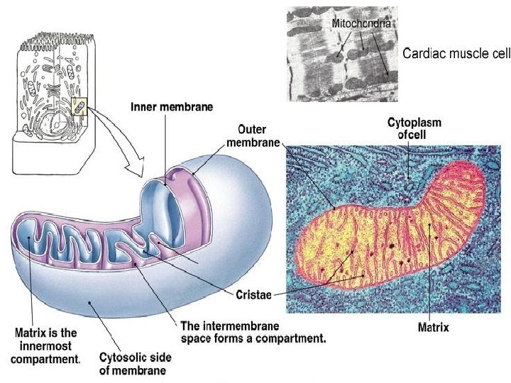 MITOKHONDRIA q Fungsi : respirasi sel → menghasilkan ATP melalui terbentuknya gradien elektrokimia transmembran dari proton (H+) q Mempunyai 2 membran (membran dalam & luar) dan intermembrane space serta matriks dan krista q Membran luar → porin VDAD : saluran molekul < 10 k. Da Membran dalam → rantai respirasi, sintesis ATP dan transport protein & kardiolipin (sifat impermeabel molekul kecil) Matriks → enzim-enzim pada citric cycle, ADN mitokhondria & ribosom Intermembran space → enzim pada fosforilasi nukleotida ATP q Dengan bentuk, besar, jumlah & letak bervariasi untuk tiap sel >>> mitokhondria → yang tinggi aktivitas metaboliknya : sel parietal lambung < mitokhondria → limfosit q Simbiosis dari sel purba → ADN sirkuler → semi autonom q Termasuk organel yang bukan merupakan turunan dari retikulum endoplasma selain plastida