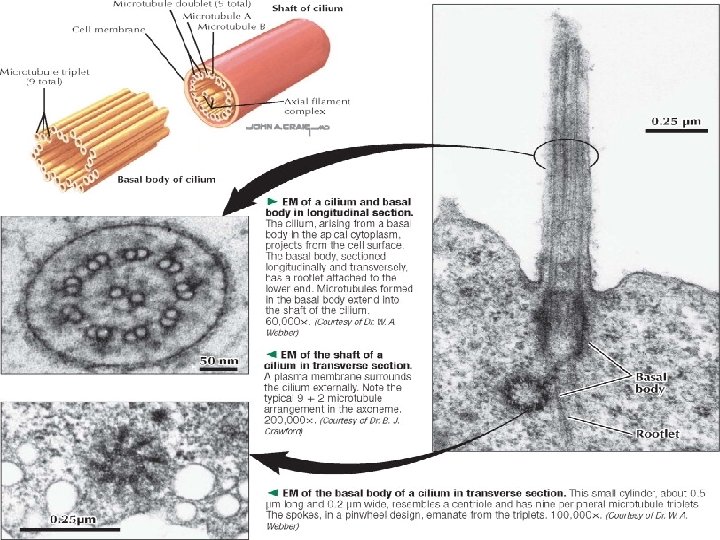 SENTRIOL q Berupa silinder pendek seperti tabung, terletak dekat inti, merupakan mikrotubulus dengan pola 9 triplet +0, disebut juga diplosom (sebagai dua yang saling tegak lurus) + matriks sitosol → sentrosom q Sebagai bagian dari MTOC dan fungsi : membentuk spindel pada pembelahan sel, berreplikasi & menuju permukaan sel membentuk badan-badan basal (kinetosom) → silia dan flagela, dan terlibat pada proses-proses lain dengan mikrotubulus. SILIA DAN FLAGELA q Sebagai organel yang menonjol pada permukaan sel sebagai penggerak sel atau bahan-bahan sepanjang permukaaan sel q Silia ( = 0, 2 µm & d = 5 -10 µm) → seluruh sel atau tunggal → rambut q Flagela ( = 15 -30 µm & d = dapat hingga 200 µm) → satu atau dua pada sel → cambuk q Keduanya mempunyai badan basal sebagai dasar dengan pola 9 duplet +2