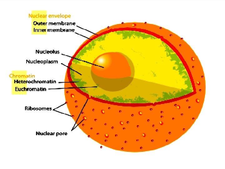 NUKLEUS q Terdiri : membran nukleus, nukleoplasma, nukleolus & butir kromatin yang mengandung ADN q Merupakan pusat pengontrolan sel , bersifat autonom, terdapat bahan-bahan genetis dan nukleolus q Fungsi : transkripsi, replikasi, sintesis ribosom dan RNA, RNA splicing dan sebagai pusat komunikasi untuk bertukar informasi dengan sitosol