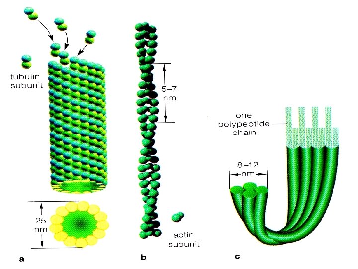 Sitoskeleton. (a) Sitoskeleton sebagai tempat bersandar organel dan juga berperan dalam pergerakannya. (b) Mikrotubulus. (c) Filamen aktin yang mengandung molekul protein aktin. (d) Perbandingan secara garis besar mikrofilamen (filamen aktin), mikrotubulus dan filamen intermediat.