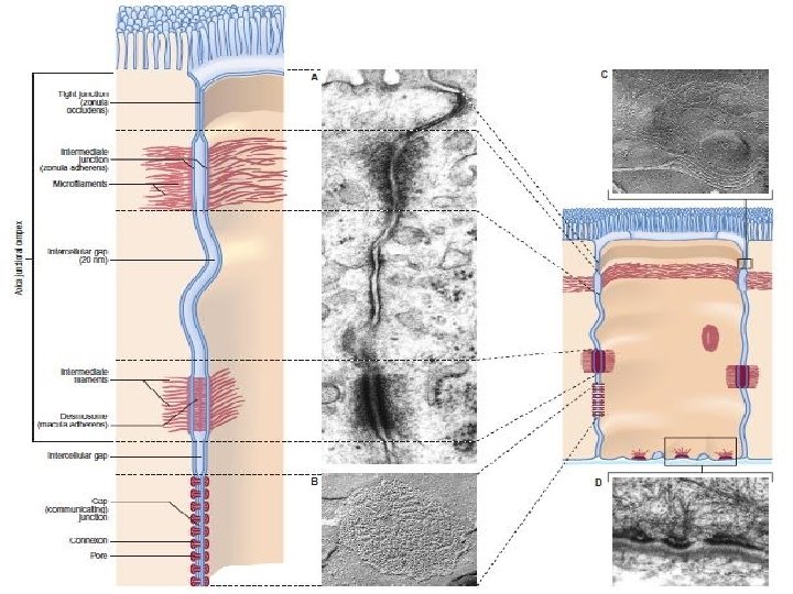 CELL JUNCTION/PERTAUTAN SEL q Terdapat hubungan sel dengan sel lain serta ECM (disekresi oleh sel-sel di sekitarnya & tersusun : kolagen & proteoglikan) q Bentuk, motilitas, polaritas sel ditentukan oleh interaksinya q Fungsi : barrier, memelihara polaritas, bentuk sel dan sarana komunikasi q Terbagi atas : → Tight junctions (zonula occludents) : impermeabilitas, cth : Blood Testis Barrier & Blood Brain Barrier → Anchoring junctions (adherens junction) : penghubung saling lekat • belt desmosom (zonula adherens) & focal adhesions • spot desmosom/desmosomes/macula adherens • hemidesmosomes → Gap jungtions : penghubung dengan pori → sebagai komunikasi & transport molekuler antar sel yang berdekatan untuk molekul < 1500 Da, cth : pada sel jantung, plasmodesmata pada tumbuhan