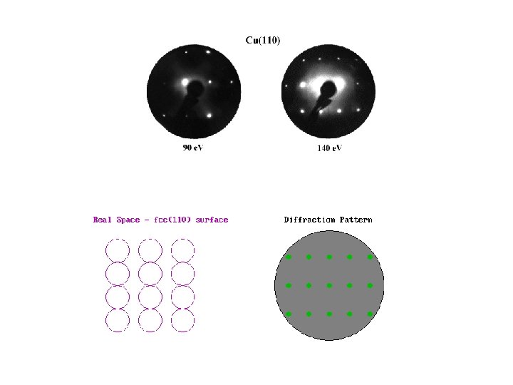 LEED: Si(111)7 x 7 Real Space: Si surface atoms • • Larger D spacings give closer LEED spots (smaller f). Higher energy electrons give closer spots. 7× bulk spacing Surface 7 x spacing Bulk 1 x spacing 35 e. V 65 e. V