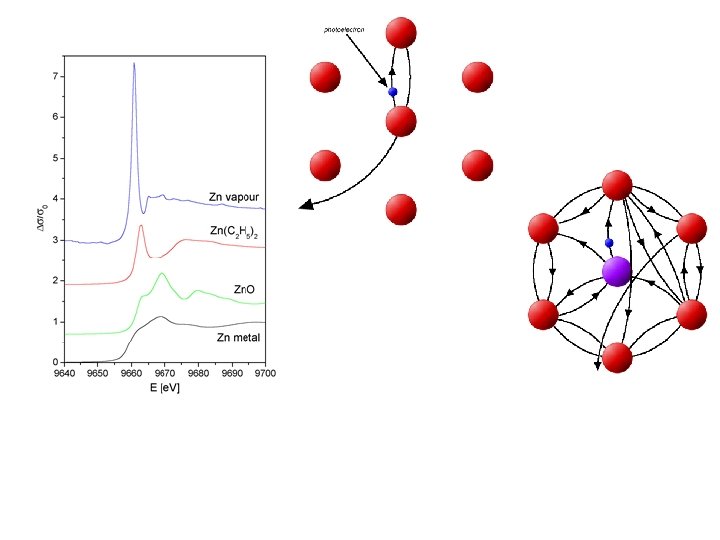 SEXAFS – Surface Extended X-Ray Absorption Fine Structure NEXAFS – Near Edge X-Ray Absorption Fine Structure (XANES) Detekce fotoelektronů, Augerových elektronů Chemická selektivita!!! NEXAFS – 50 e. V od hrany, komplikovaný mnohonásobný rozptyl, vliv detailního rozdělení el. hustoty Studium molekul (dominují intramolekulární procesy)
