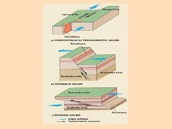 -do pomicanja može doći i u horizontalnoj ravnini STRIKE-SLIP (pružno-klizni) rasjedi (TRANSKURENTNI) preuzeto iz: Wicander, R. & Monroe, J. S. (1999): Essentials of Geology uzdužni poprečni dijagonalni preuzeto iz: Herak, M. (1990): Geologija skokovi kod horizontalnog rasjedanja su zanemarivi, ali je hod izrazit tri tipa rasjeda: UZDUŽNI – paraklaza je paralelna s pružanjem slojeva POPREČNI – paraklaza je okomita na pružanje slojeva DIJAGONALNI – paraklaza se pruža koso u odnosu na pružanje slojeva (sječe slojeve pod kutom)