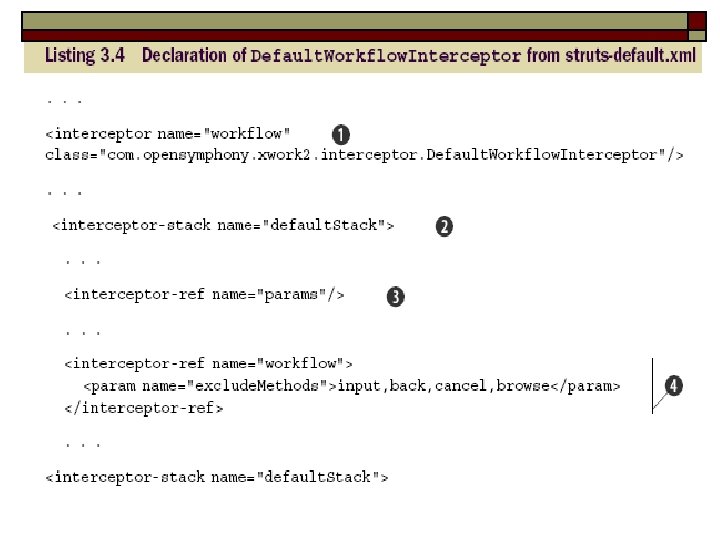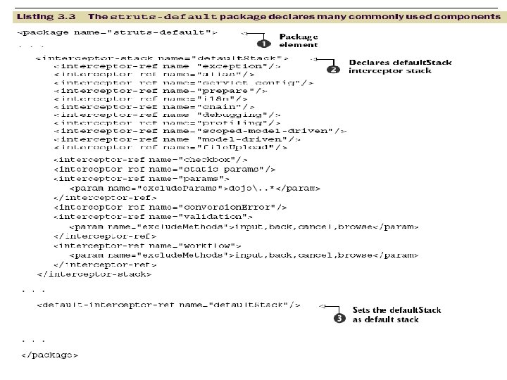 Declarative architecture o JAVA ANNOTATION–BASED Declarative Architecture n A relatively new feature of the Java language, annotations allow you to add metadata directly to Java source files. n Java annotations support for tools that can read metadata from a Java class and do something useful with that information. n Struts 2 uses Java annotations in this way. n If you don’t want to use XML files, the declarative architecture mechanism can be configured to scan Java classes for Struts 2–related annotations. n Listing 2. 2 shows what these annotations look like.