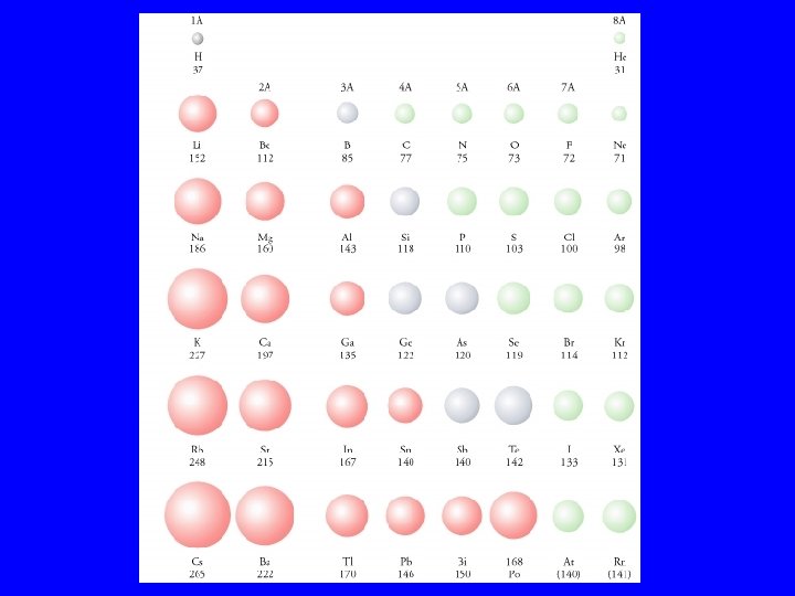 Raggio atomico Un atomo non ha una grandezza definita in quanto la distribuzione statistica degli elettroni non termina bruscamente ad una certa distanza ma diminuisce gradualmente con la distanza dal nucleo. Di conseguenza le dimensioni di un atomo sono definite in maniera alquanto arbitraria e diverse definizioni di raggi atomici sono possibili. La più comune si riferisce ai raggi covalenti, ricavati dalla distanza fra i nuclei in composti molecolari H 2, Cl 2, ecc. I raggi atomici seguono il seguente andamento: - diminuiscono da sinistra a destra lungo un periodo - aumentano scendendo lungo il gruppo