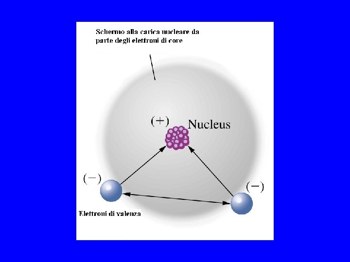 Questo andamento può essere spiegato sulla base dei fattori che influenzano le dimensioni dell'orbitale più esterno: 1. maggiore è il numero quantico n più grande è l'orbitale 2. maggiore è la carica nucleare efficace più piccolo è l'orbitale La carica nucleare efficace è la carica positiva netta di cui un elettrone risente tenendo conto dell'azione di schermo degli elettroni più interni. Li litio 1 s 2 2 s 1 Z=3 Zeff=3 -2=1 per l'elettrone 2 s La carica nucleare efficace aumenta lungo un periodo perchè aumenta Z ma non gli elettroni del core.