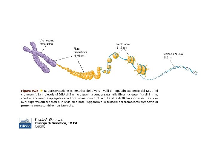 Struttura dei cromosomi negli eucarioti I livelli di impacchettamento del DNA nei cromosomi degli eucarioti Il più grande cromosoma nel genoma umano contiene circa 85 mm di DNA. Questa molecola di DNA viene impacchettata in una struttura metafasica di 0, 5 m di diametro e 10 m di lunghezza. Quando la cromatina isolata da cellule in interfase viene esaminata al microscopio elettronico, si vede che è formata da La “perla” o subunità della cromatina una serie di “perle” ellissoidali di circa 11 nm viene detta NUCLEOSOMA di diametro.