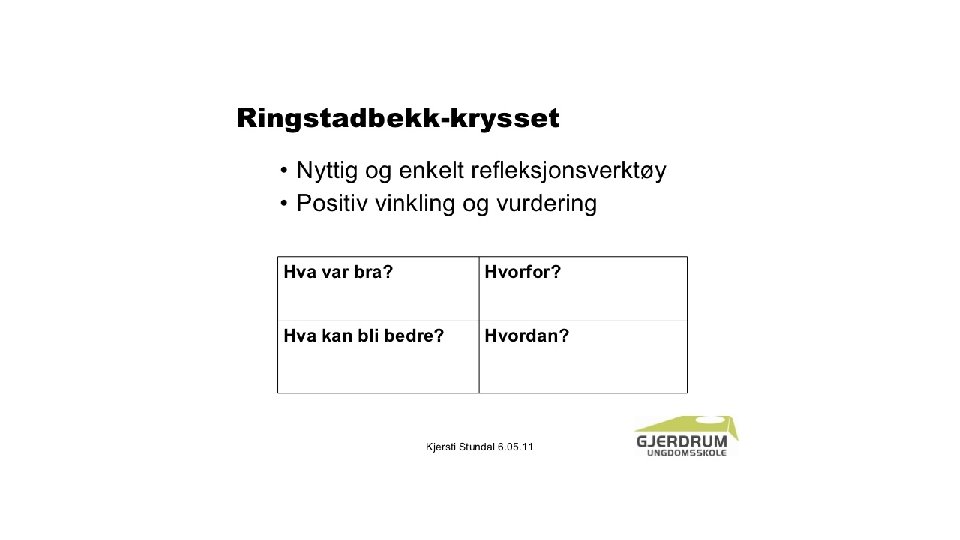 FASE 3: Analyse- og tiltaksfase (Etter påske) • Drøfte materialet fra både 1 og 2 og ved hjelp av SWOT eller RBK. • Oppsummering pr trinn/gruppe • Felles oppsummering • På bakgrunn av dette: Foreslå satsingsområder for videre arbeid • Disse vedtas • Oppsummering med FAU, repr. Fra skolefagstab og repr fra ansatte (mai/juni) • Ferdig. Bruke det.