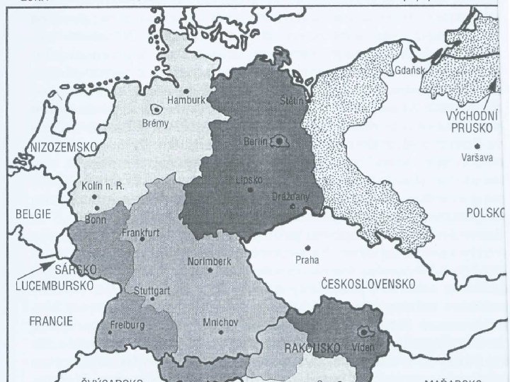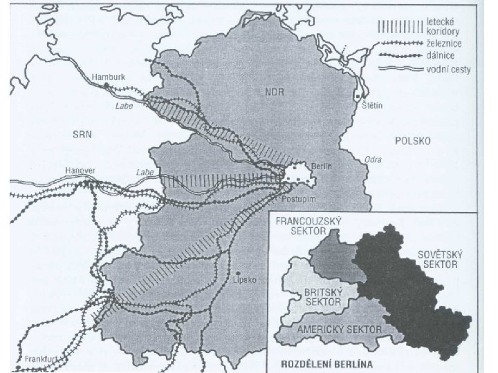 2. Německá otázka Dva rozdílné přístupy: q Sovětský svaz – vytvoření sjednoceného a neutrálního Německa; q USA a Velká Británie – Německo jako součást Západu. Zakotvení Německa v západním světě a později i v NATO - základ tzv. strategie dvojího zadržování q Německo jako pevná součást Západu – cíl: zabránit realizovat nacionalistickou zahraniční politiku q současně důležitá součást poměru sil při „zadržování“ Sovětského svazu. Vývoj: - 1946 – vznik Bizonie; - 1948 – souhlas Francie s připojením k Bizónii (tzv. Trizonie); - 1948 - separátní měnová reforma v Trizonii; - 1948 - Sovětský svaz vyhlásil blokádu západního Berlína; - 1949 - blokáda ukončena - září 1949 - vyhlášení vzniku SRN - říjen 1949 - vyhlášení vzniku NDR