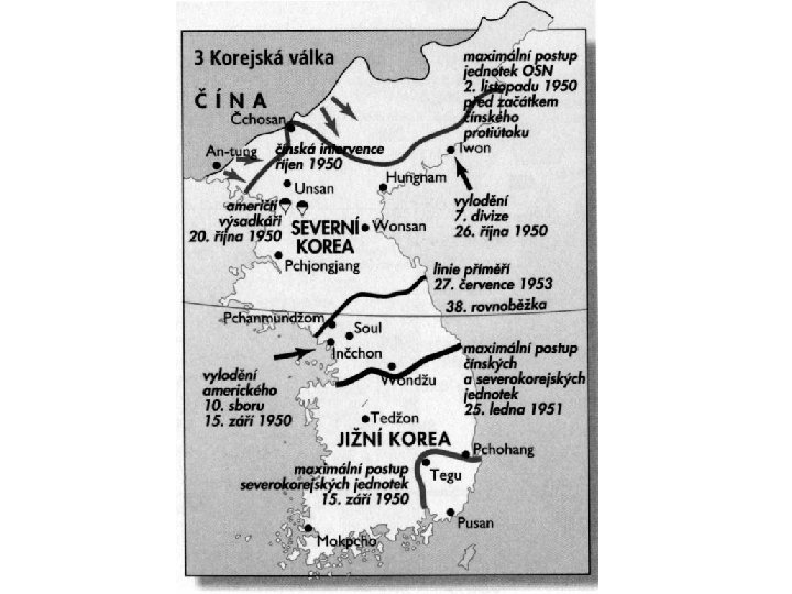3. Korejská válka q KLDR nepovažovala za možné, že se USA postaví na odpor na posledním výběžku Korejského poloostrova potom, co přenechaly většinu asijské pevniny komunistům; q USA k agresi přistoupily nikoli z geopolitického významu Korejského poloostrova, ale z principu obrany proti hrozbě komunismu a obrany svobodného světa Červen 1950 překvapivý útok KLDR přes 38. rovnoběžku; Vylodění amerických jednotek v jejich týlu vytvořila tři možnosti: q zastavení vojsk na 38. rovnoběžce a obnovení původního stavu; q postup dále na sever a potrestat agresora; q postup až k čínské hranici a sjednocení Koreje. Mao-Ce-tung postup amerických jednotek až k čínské hranici vyhodnotil jako obkličování Číny a nový pokus USA zvrátit vítězství komunistů v čínské občanské válce; Proto: zastavit americké jednotky na postupu k čínské hranici a vyloučit nutnost bojovat s nimi na čínském území.