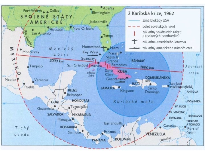 5. Kubánská raketová krize 1962 Příčina: rozhodnutí sovětského vedení rozmístnit sovětské jaderné rakety na Kubě s cílem vytvořit diplomatický tlak na USA Cíl: q zamezit dalšímu americkému útoku na Kubu; q nastolit rovnováhu vůči raketovým základnám USA v Turecku; Reakce USA: q požadavek odstranit už rozmístněné rakety; q uvalení námořní blokády na lodě s útočnými zbraněmi směřující na Kubu; q masivní přesun vojenských jednotek do karibské oblasti; q hrozba jadernou odvetou proti sovětskému území; Kompromis: souhlas s demontáží sovětských raket pokud: q USA přijmou závazek respektovat režim na Kubě; q budou demontovány americké rakety v Turecku