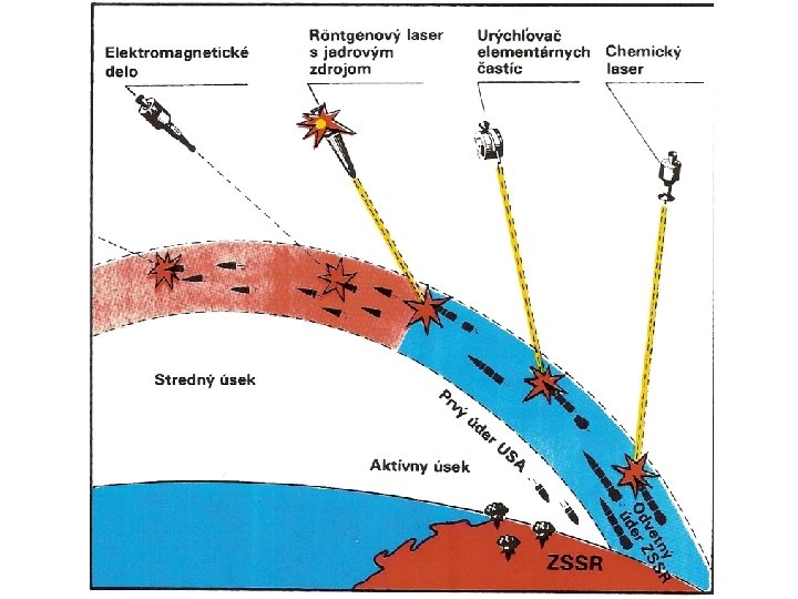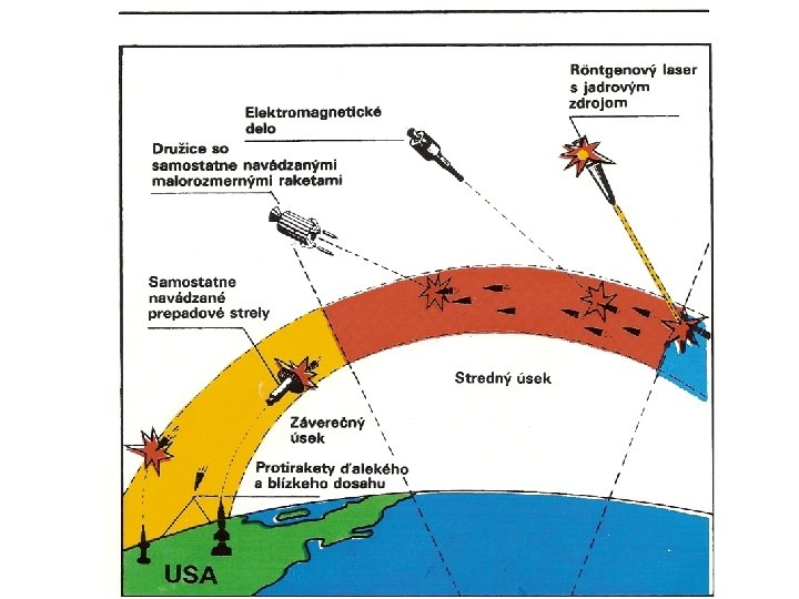 Strategická obranná iniciativa - projekt rozsáhlého výzkumného programu zaměřeného na vývoj systémů PRO umístěné v kosmickém prostoru (SDI); Cíl: q získat schopnost realizovat první jaderný úder na základě možnosti PRO zastavit oslabený odvetný úder protivníka; q nahradit dosavadní koncepci „vzájemného zaručeného zničení“ koncepcí „zajištěné obrany“ q zahájit novou kvalitativní etapu horečného zbrojení, která měla spotřebovat sovětské strategické zdroje; Problémy: q porušoval Smlouvu o omezení systémů protiraketové obrany z roku 1972; q narazil na odpor i v Evropě: dosažení absolutní bezpečnosti USA znamenal hrozbu porušení „vzájemné spojitosti“ americké a evropské bezpečnosti.