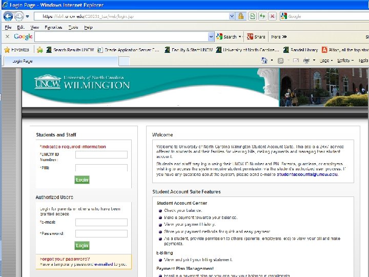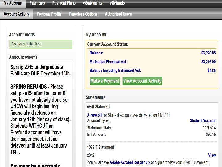 Authorized Users FERPA Students must setup authorized users Students can setup multiple authorized users Authorized User will receive email with username and password information – Must Login! Look in Spam/Junk folder for initial authorized user email Authorized Users will receive the following notifications: v E-bill uploads v Monthly newsletters