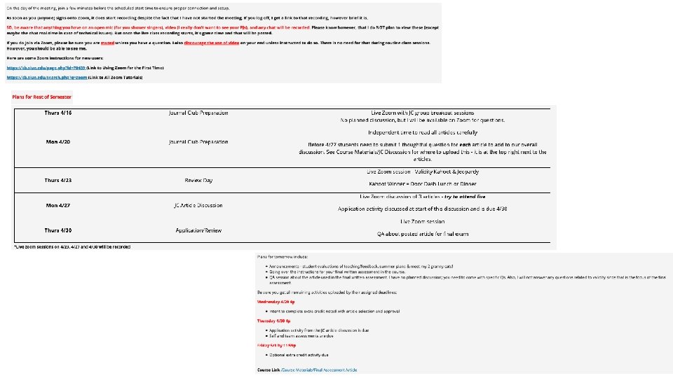 Class Organization • • • Pre-class Set a calendar invite with zoom link for class meeting times Record zoom sessions for later viewing In-class Consider ice-breakers if students do not know each other Host routine, online open office hours Speak to students by name whenever possible Consider more frequent breaks; use a timer, if needed