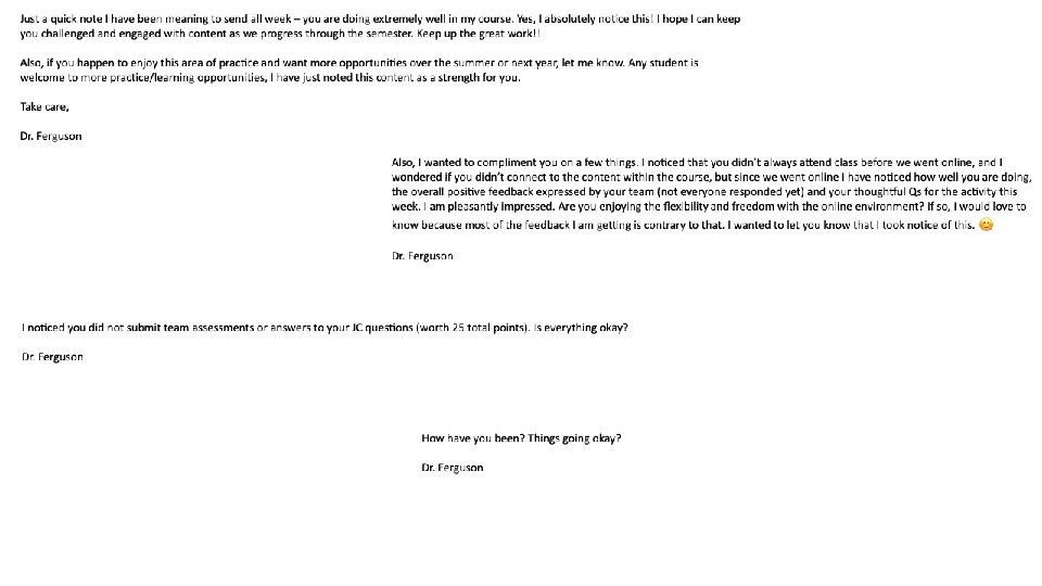 Assessment Strategies ● ● ● ● Create reflective assignments Personalize feedback as much as possible Recognize individual growth over time Consider more frequent, lower-stakes quizzes and assignments For group projects, have students work outside of class Collaborative group note-taking Offer student options for feedback and type of assessment Use a variety of approaches to explain a concept