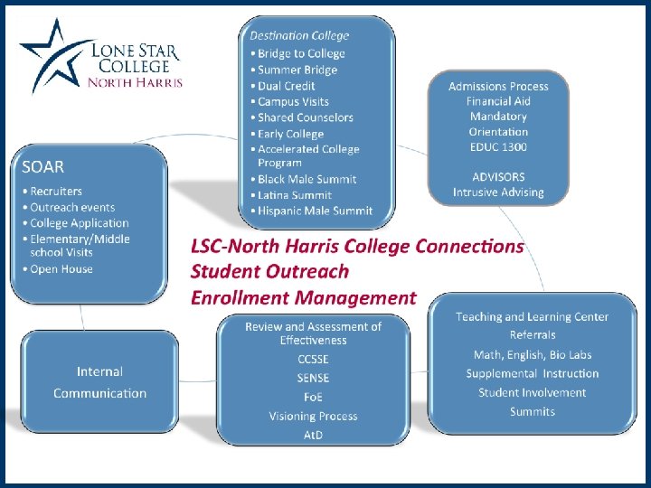 Retention Starts at the Connection • Destination College • Outreach and Marketing • SOAR (Student Outreach and Recruiting) • Developing College Going Culture • ABE, GED, ESL transitions • Community involvement • Parental engagement