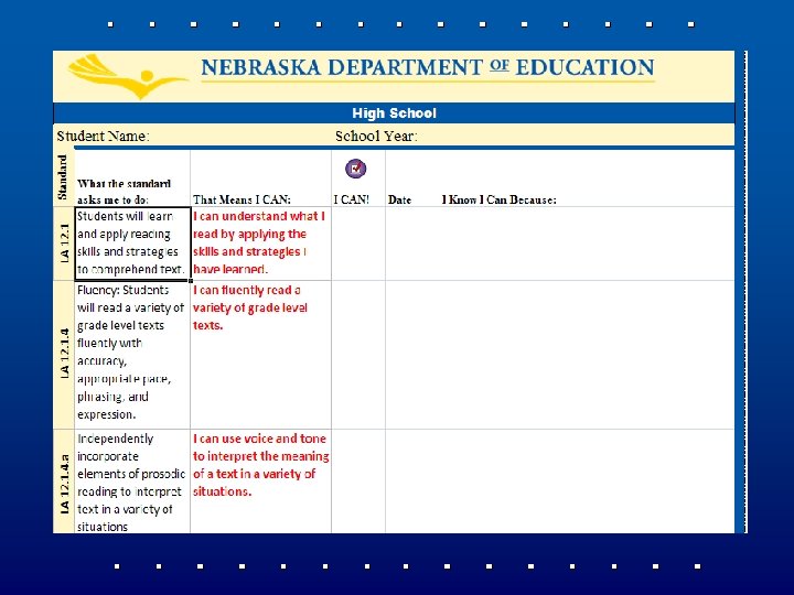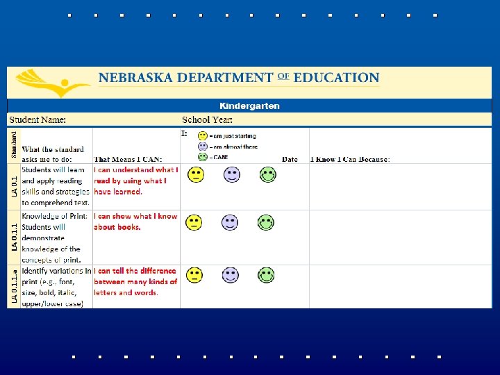 Student-Friendly Standards • Process began in March, 2011 as an outgrowth from the Nebraska Literacy Plan • Aligned to the NE Language Arts Standards • K-12 for all standards and indicators