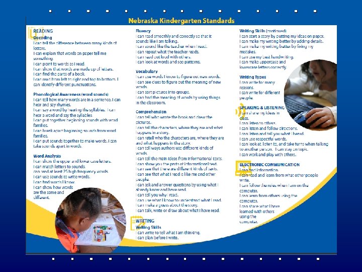 How do the Student-Friendly Standards relate to the Nebraska Literacy Plan? • They fit into 4 areas of the model: Standards. Aligned Curriculum (Pre-K– 12) Universal Instructiona l Design Principles High. Quality, Balanced System of Assessmen ts Family, Community, and School Collaboratio n