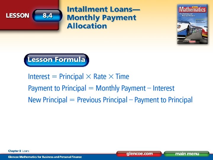Lesson Objective Calculate the payment to interest, payment to principal, and new balance. Content Vocabulary repayment schedule Shows the distribution of interest and principal over the life of a loan.