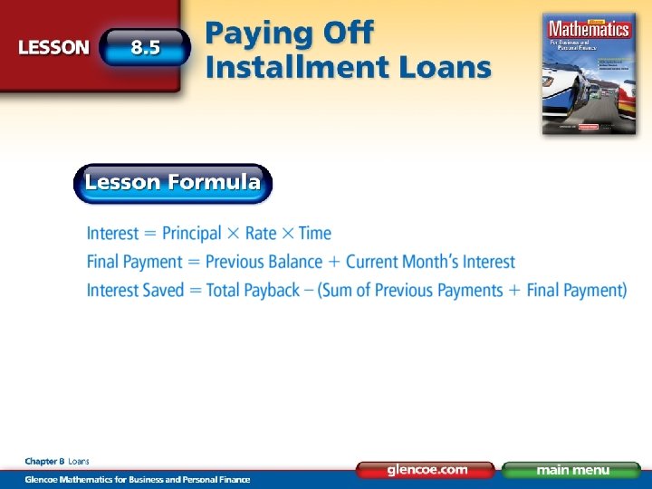Lesson Objective Compute the final payment when paying off an installment loan. Content Vocabulary final payment Payment on a simple interest loan that consists of the previous balance plus the current month’s interest.