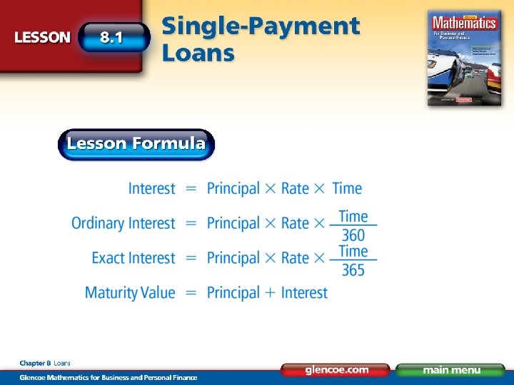 Lesson Objective Compute the maturity value and interest rate of a single-payment loan. Content Vocabulary term ordinary interest exact interest term interest ordinary exact interest The amount Interest on a of loan time calculated for whichby a loan is granted. basing the loan’s time period on a 365 -day 360 -day year.