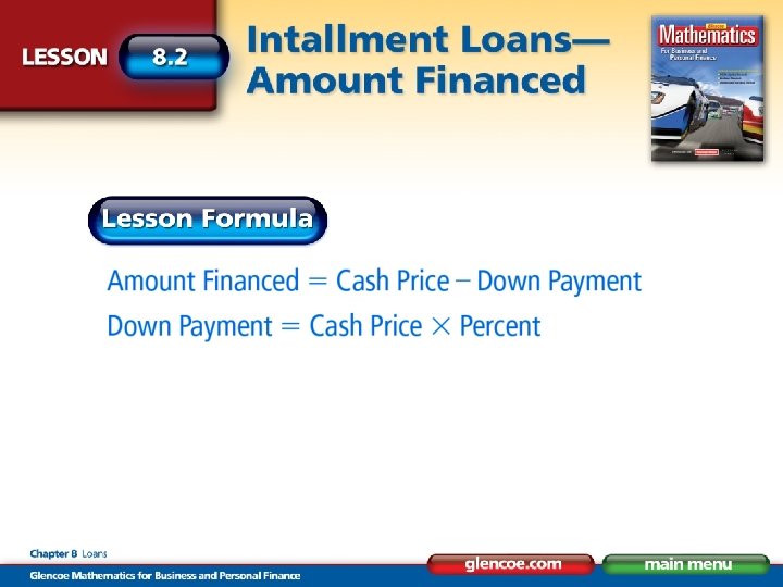 Lesson Objective Calculate the down payment and the amount financed on an installment loan. Content Vocabulary installment loan down payment amount financed installment down amount payment financed loan The A loan portion youofrepay of thethe cash incash equal price payments of owed an item overare you after a making specified purchasing the period down which payment. of time. you pay before financing the rest on credit, usually required when purchasing an item with an installment loan.