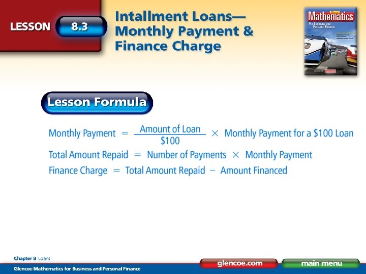 Lesson Objective Calculate the monthly payment, total amount repaid, and finance charge on an installment loan. Content Vocabulary annual percentage rate (APR) An index showing the cost of borrowing money on a yearly basis, expressed as a percent.