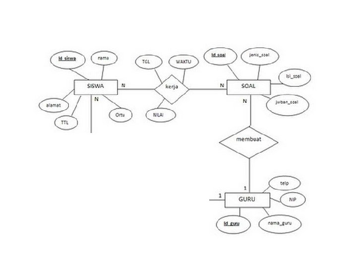 Contoh 2 • Buatlah ERD untuk kasus quiz online (seperti quiz online Basis data / Pemrograman). • Deskripsi: dosen membuat soal yang kemudian akan dikerjakan oleh mahasiswa secara online.