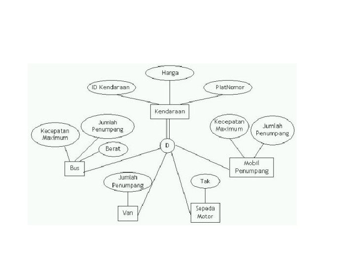 Contoh 4 • Desain sebuah generalisasi – spesialisasi hirarki untuk sebuah perusahaan kendaraan bermotor. Perusahaan menjual sepeda motor, mobil penumpang, van, dan bus. Tentukan penempatan atribut Anda pada setiap level hirarki.