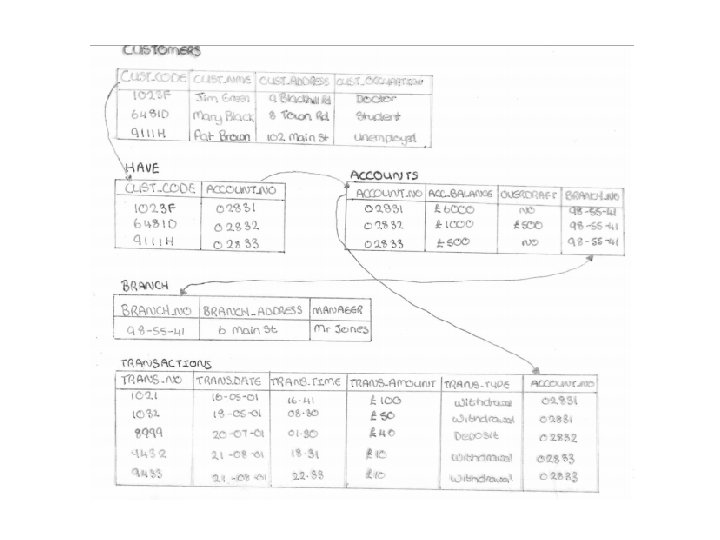Contoh 5 • Sebuah bank memiliki beberapa cabang di daerah yang berlainan. Masing-masing cabang memiliki pelanggan yang relatif banyak. Sebuah rekening mungkin saja dimiliki oleh beberapa pelanggan dan setiap pelanggan boleh memiliki beberapa rekening. Gambarkan skema ERD dan tabel untuk kasus ini.