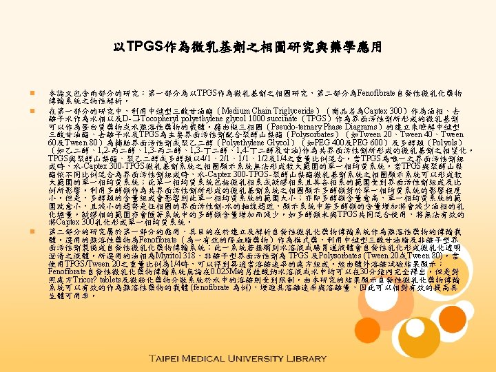 Studies on the Phase Diagrams of TPGS Based Microemulsion Systems and Their Pharmaceutical Applications n n n This dissertation is composed of two parts of studies; the title of part I is “Studies on the Phase Diagrams of D-�-Tocopheryl Polyethylene Glycol 1000 Succinate (TPGS) Based Microemulsion Systems” and that of part II is “Physical Characterization of Self-Microemulsifying Drug Delivery System for Fenofibrate”. Attempts in part I of the dissertation were to develop microemulsion systems using medium chain triglyceride (MCT), Captex 300, deionized water (H 2 O), and TPGS as surfactant for the oral delivery of protein drugs or poorly water soluble drugs. Pseudo-ternary phase diagrams were constructed to elucidate the phase behavior of systems composed of medium-chain triglyceride and water with TPGS as main surfactant, polysorbates (Tween 20, Tween 40, Tween 60 and Tween 80) as adjuvant surfactants, and polyethylene glycols (PEG 400 and PEG 600) and polyols (ethanediol, 1, 2 propanediol, 1, 3 -butanediol, 1, 4 -butanediol and glycerin) as cosurfactants. The weight ratios of TPGS to Tweens, PEGs or polyols (Km) were set at 4/1, 2/1, 1/2, and 1/4. The phase diagram for H 2 O/Captex 300/TPGS system reveals that when TPGS was used as a sole surfactant, it is not capable of producing isotropic solutions of water and Captex 300 over a wide range of the compositions. H 2 O/Captex 300/TPGS/Tweens systems with various Km, regardless of the adjuvant surfactant used were capable of producing an isotropic phase. The extension of microemulsion phase and the presence and extension of the gel phase were found to be dependent on the surfactant mixture. The phase diagrams of H 2 O/Captex 300/TPGS systems using polyols as cosurfactants demonstrate that the types of polyols have a slight effect on the region of existence of the microemulsions. Comparison between the isotropic regions for the polyols system reveals that as the relative concentration of polyols increase, the isotropic region decrease in size. This decrease is towards the surfactant mixture ( Smix)-water axis indicating that as the relative concentration of polyols increases the maximum amount of oil solubilized decreases. The gel region decreased in size with the increase of polyols weight ratio. All polyols do not solubilized Captex 300 without using TPGS as surfactant. The part II of this dissertation is the application of the studies of part I. Attempts in part II of the dissertation were to develop and characterize the selfmicroemulsifying drug delivery systems (SMEDDSs) for poorly water soluble drugs. Fenofibrate (an effective agent for the treatment of various types of dyslipidemia) was selected as a model drug that was formulated in a Myritol 318 and nonionic surfactant mixtures of TPGS and polysorbates (Tween 20 or Tween 80), which exhibited self-microemulsifying characteristics under conditions of gentle agitation in an aqueous medium. Using TPGS/Tween 20 as the mixture of surfactant (Smix) at a Km value of 1/4 was found to yield the desired SMEDDSs for fenofibrate. In vitro dissolution studies illustrated that the release of fenofibrate from SMEDDSs was complete within 30 minutes either in 0. 025 M SLS solution or water medium. But the release of fenofibrate from Tricor? tablets or micronized fenofibrate dispersion systems (MDSs) was limited in water medium. The present study also revealed that the self-microemulsified drug delivery system of poorly-water soluble drugs exemplified by fenofibrate increased their dissolution rate leading to enhance their bioavailability correspondingly.