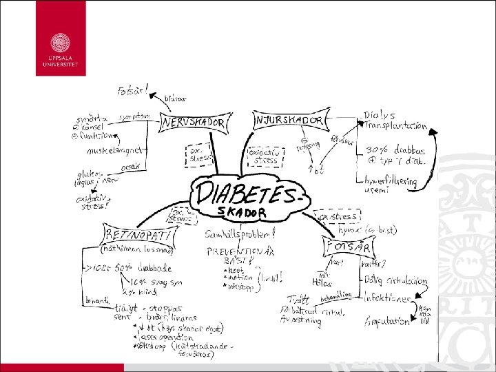 Mindmapping VARFÖR? • Enbart till för repetition – inte för lärande av ny kunskap! • Bilder, form och färger istället för enbart text! • Använder båda hjärnhalvor – minns bättre. • Föreläsaren återknyter – lättare att få in på rätt plats utan rörighet. HUR? • Skriver/ritar ämnet i korta nyckelord. • Huvudrubrik med underrubriker med sammanbindande linjer. • Förklarande/beskrivande nyckelord på linjen. • Inte linjerat eller rutat papper. • A 3 -papper. • Använd bilder och symboler. • Förkorta systematiskt.