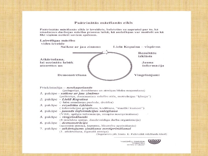 M. Noula ieguldījums mūžizglītības teorijas un prakses tālākā attīstībā Daudzas skolas meklē iespējas, kā nenoslēgties tikai pragmatisku uzdevumu risināšanā izglītības standartu apguves nodrošināšanai, bet tieši vai netieši sekmē audzēkņu resursu atklāšanu un atbalstīšanu, lai palīdzētu viņiem vēlāk iesaistīties pieaugušo izglītības procesā. [Koķe T. 2001, 2002. ] üSkolotāju tālākizglītošanās, lai iepazītu interaktīvas darba formas un metodes. Tas palīdz izzināt audzēkņu vajadzības, intereses, pieredzi u. c. , mācot to izprast un reflektēt utt. ; üAudzēkņu rosināšana uzņemties atbildību par savu mācību darbu, pašvirzītas mācīšanās un motivācijas sekmēšana (piemēram, to sekmē skolu audzēkņu iesaiste projektu darbos, interešu izglītībā u. c. ) üAudzēkņu iesaiste pētnieciska rakstura darbībā un jaunu zināšanu (sev) radīšanas procesā utt.