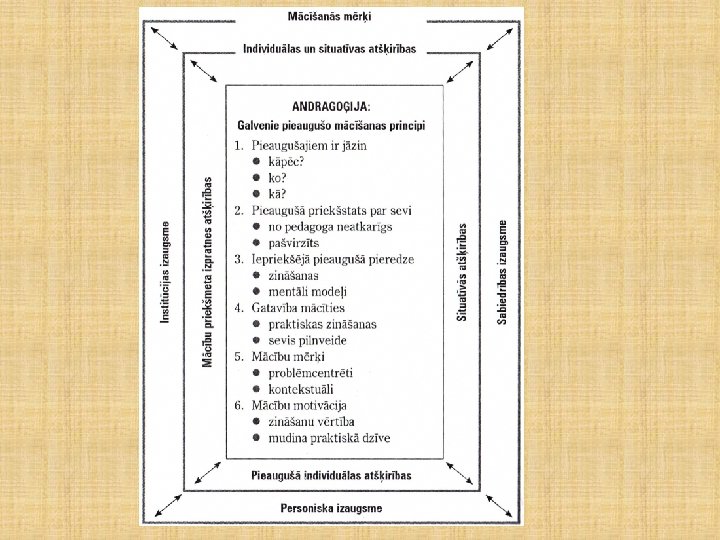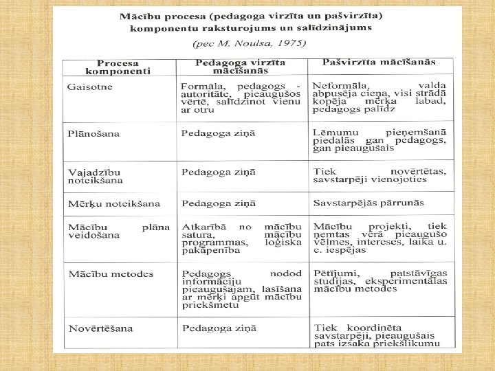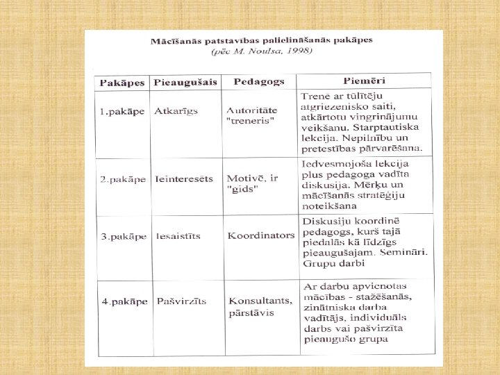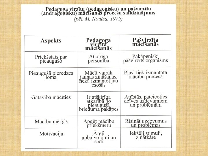 M. Noula izstrādāto viedokļu par pedagoģiju un andragoģiju salīdzinājums Pieņēmumi Pedagoģija Androgoģija 1. Priekštats par sevi Atkarība Pieaugušo spēja sevi vadīt 2. Pieredze Nenozīmīga Pieredze ir cilvēku mācīšanās resurss 3. Gatavība mācīties To nosaka bioloģiskā gatavība un sociālais spiediens To nosaka ir cilvēku mācīšanās resurss 4. Orientācija mācīties (“laika perspektīva”) Orientācija uz priekšmetu, uz zināšanu vēlāku izmantošanu Orientācija uz problēmu pašreizējā dzīves situācijā 5. Motivācija mācīties Bieži motivē “ārējs spiediens” Nozīmīgāka ir iekšējā motivācija (pašcieņa, dzīves kvalitāte u. c. ) /Lieģeniece D. 2002. /