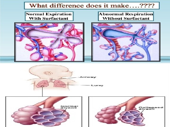 • Since Lung is last organ to mature. • Premature babies has insufficient lung surfactant lining in the alveoli walls. • Which supports no normal respiration. • Has respiration difficulties due to alveolar collapse.