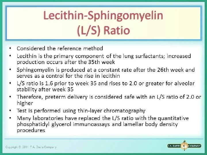 • Lecithin /Sphingomyelin (L/S) ratio of amniotic fluid, collected by Amniocentesis is a good indicator to evaluate fetal lung maturity.