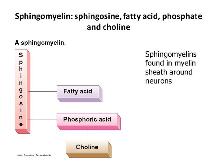 • Sphingosine is linked with a Fatty acid by an amide linkage to form Ceramide. • Ceramide is then linked to Phosphoric acid and Choline to form Sphingomyelin.