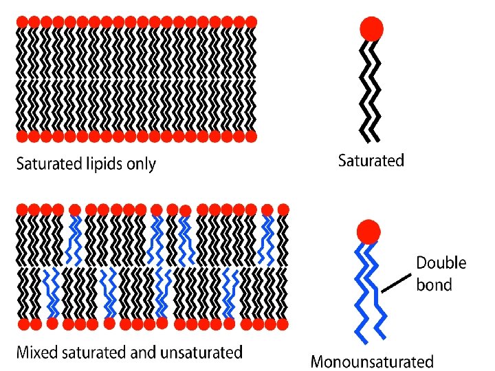 • Phospholipids may have fatty acids which are saturated or unsaturated. • This affects the properties of the resulting bilayer/cell membrane: