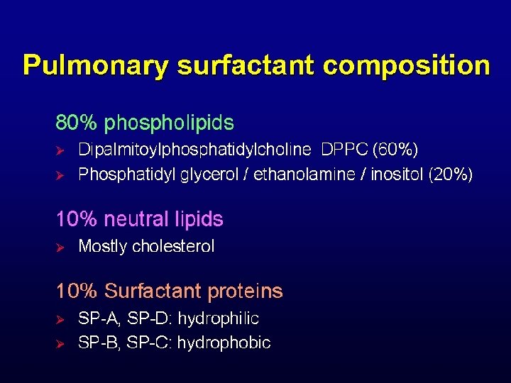 • Di. Palmitoyl Phosphatidyl Choline serve as an Lung surfactant. • It Lowers surface tension and keeps Alveoli of lungs blown. (prevent adherence of alveoli) • Enables effective exchange of gases (Oxygen) in Lungs.