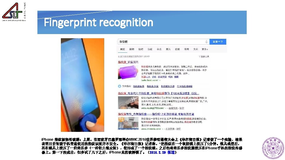 Speaker recognition • Advantages of Speaker recognition ² Speech signal more accessible ² The use more acceptable by users ² Remote authentication more convenient • Application scenarios ² Access control (e. g. voice lock) ² Transaction authentication (e. g. remote payment) ² Forensic analysis (e. g. police criminal detection)