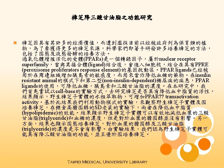 Study on the hypotriglyceridemic effect of Antrodia camphorata in rats with high-cholesterol diet n Antrodia camphorata (A. camphorata) is a kind of fungus and parasite on the inner heartwood wall of Cinnamonum kanehirai in wilderness. It is a Taiwan-specific and known traditional Chinese medicine, and has been used to treatment of diarrhea, hypertension, itchy skin, and liver cancer. It also exhibits several biological activities such as antioxidative and hepatoprotective activities. To gain large amount of A. camphorata, several culture technologies have been developed, including solid-state culture and liquid-state fermantation. Peroxisome proliferators activated receptors (PPARs) are transcription factors belonging to the nuclear receptor superfamily, and PPAR? ? subtype has been described as a hypoglycemic agent that increase insulin sensitivity in peripheral tissues, and resulted in reducing blood glucose, insulin and triglyceride levels in insulin resistant animal and in type-2 (non-insulindependent) diabetic patients. In this study, first we want to investigate the possibility of A. camphorata on the hypolipidemic activity by cell-base experiment. Second, we want to compare the hypolipidemic effect between solid-state culture and wild fruiting body of A. camphorate in animals. The results showed that water extracts of wild fruiting bodies were able to increase the PPAR? ? transactivation activity by transfection of PPAR? ? reporter plasmid. Base on the cell experiment, we have examined the hypolipidemic effect of solidstate culture and wild fruiting body of A. camphorata in SD rat fed with high cholesterol diet. The results showed that wild fruiting body was able to decrease the triglyceride and glucose levels, but could not affect the cholesterol level. On the other hand, solid-state culture of A. camphorate had no significant effect on the blood levels of triglyceride and cholesterol. These results suggest that wild fruiting body may exhibit a hypotriglyceridemic effect, and has more effect than solid-state culture of A. camphorate on the hypotriglyceridemic activity.