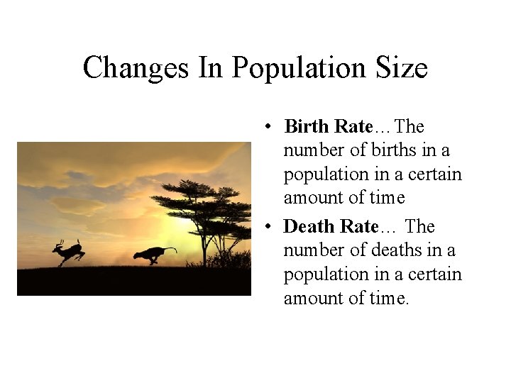 Changes In Population Size • Birth Rate…The number of births in a population in a certain amount of time • Death Rate… The number of deaths in a population in a certain amount of time.