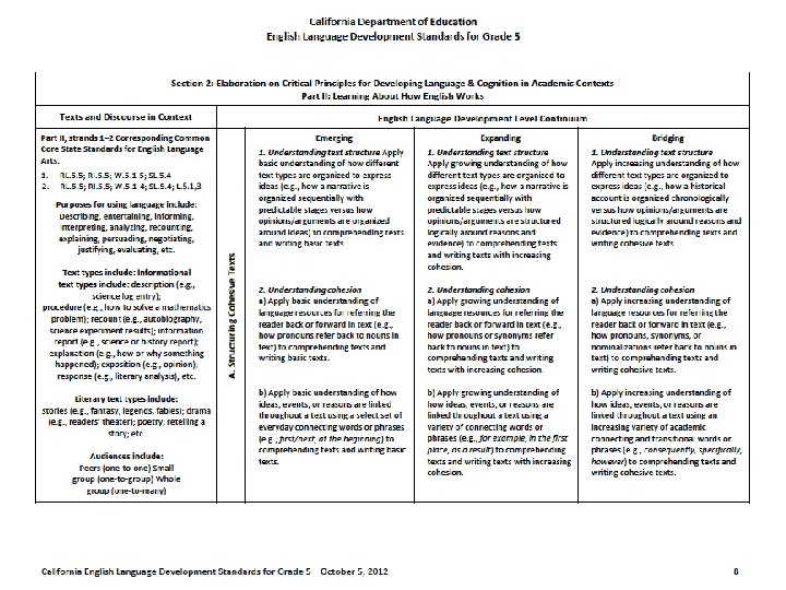 Study Task 6 Studying grade-specific ELD Standards and the descriptors (Emerging, Expanding, Bridging) in order to better understand articulate the Part II strands. Page 6