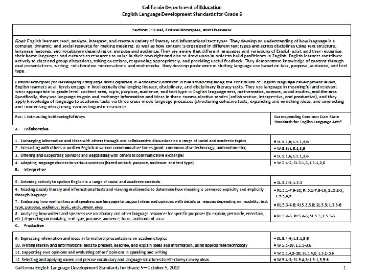 A Little Context English Language Development Standards? —A difficult task. Variance among English Learners in terms of • the age and grade when they enter a U. S. school • prior and/or current exposure to English outside of school • their first language and its similarities to and/or differences from English • their academic proficiency in their home language