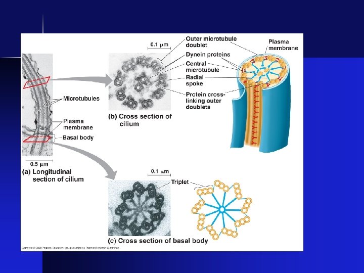 Cilia and Flagella • Occur in a 9+2 pattern – 9 microtubules doublets in a ring surrounding 2 single microtubules • Connected by crosslinked proteins called dyneins