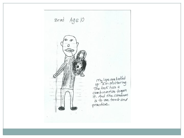 Awareness and Anxiety (continued) • Head and eye movements (Conture and Kelly, 1991) • Pitch rise, schwa substitutions, fear, avoidance behaviors, decreased speaking—electively mute • Results with Kiddy. CAT (Vanryckeghem, Brutten, & Behavior Assessment Battery (BAB) • Herandez, 2005; CWS = 4. 36 v. NFC − 1. 79 (negative self-report scores) • Using projective drawings (De. Vore, Nandur, & Manning, 1984) • smaller drawings, lower-left quadrant pre-tx