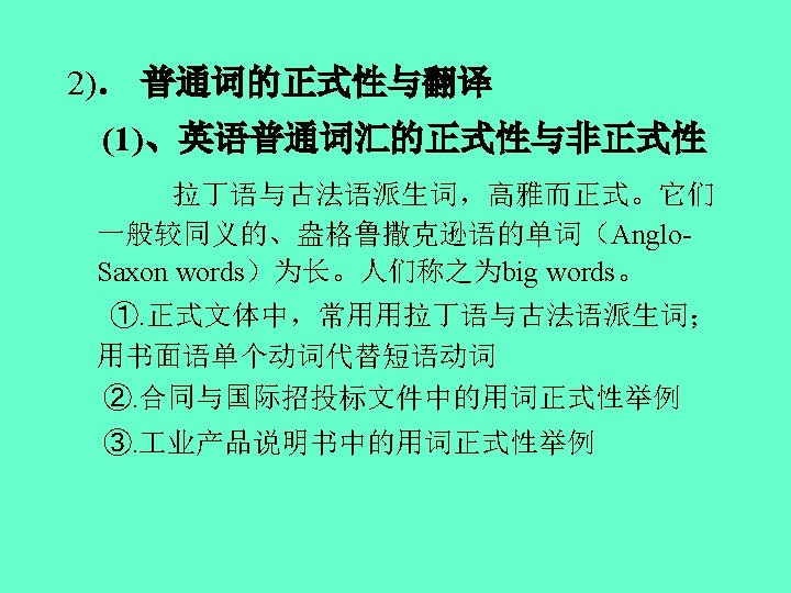 (2)、英语庄重文体中的庄重性词汇与翻译 • 例:While the principle of this invention has been described with particularity, it should be understood that various alternations and modifications can be made without departing from the spirit of the invention, the scope of which is defined by the appended claims. (以上专门阐述了本发明的原理。应该理解的是:只 要不背离本发明精神,可以对本发明实施方案进行 各种改变与修正;本发明的范围是由以下所附的专 利权项所限定的。)