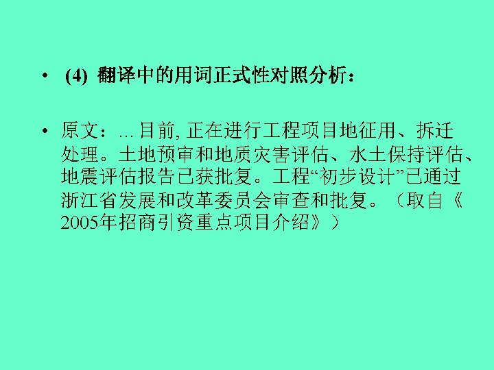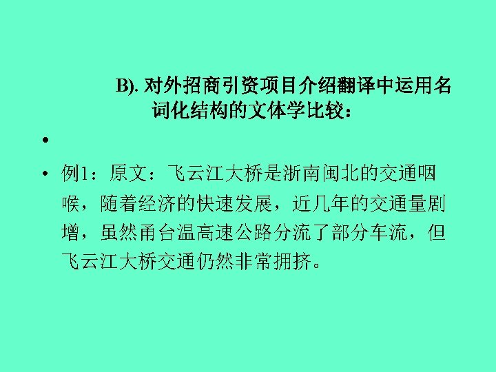 • ④.名词化结构与翻译: • A). 对外招商引资项目介绍翻译中的 • 名词化结构分析 • 例1:Project Background and Construction Conditions • As a vital passage between the south of Zhejiang Province and north of Fujian Province, the Feiyunjiang River Bridge is burdened with increasingly heavy traffic flow in recent years as the economy develops rapidly in spite of the Ningbo -Taizhou-Wenzhou Expressway that shunts traffic to some extent. The project plays a significant role in effectively bypassing the traffic across the Feiyunjiang River Bridge, relieving the traffic congestion of the city and improving the traffic passing ability. According to the Zhejiang Provincial Government Document No. 130[2000], the Feiyunjiang River Third Bridge is approved.
